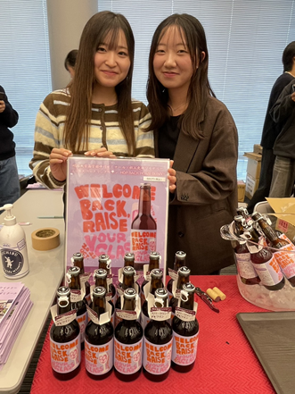 販売していたブースの隣に、日本ワインプロジェクトの活動内容を紹介するパネルを置かせていただいたところ、校友の皆様からたくさんのご質問をいただき、学生たちがより活発に交流する機会をいただくことができました。また、ゼミ生が制作したパンフレットをもらった方々からも多くの関心を寄せていただきました。